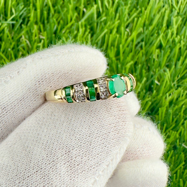 14ct Gold Emerald and Diamond Cluster Ring. The ring is set with a central oval cut emerald (0.25ct), with a cluster 5 square cut emeralds (2 points) each and 5 round cut diamonds (2 ponts) each on each side of the central emeralds. The ring is fully hallmarked for 14ct gold. The face of the ring measures 1.9cm wide x 0.5cm high and weighs 2.5 grams, UK size P and is offered in excellent condition.