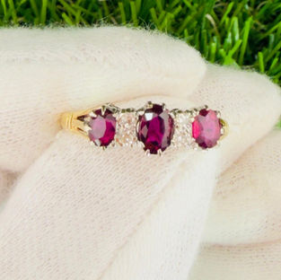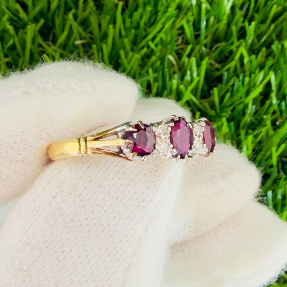 18ct Gold Antique Old Cut Ruby and Diamond Cluster Ring. The ring is set with a 3 old cut oval rubies, totaling (0.65ct) the rubies are a striking with a stunning pink/purply hue, in between the rubies are 4 old cut diamonds, totalling (0.10ct) it is a fantastic quality ring. The ring is marked for 18ct gold and is C.1910. The face of the ring measures 1.9cm wide x 0.6cm high and weighs 3.9 grams, the ring size is a N 1/2 and is offered in excellent condition.