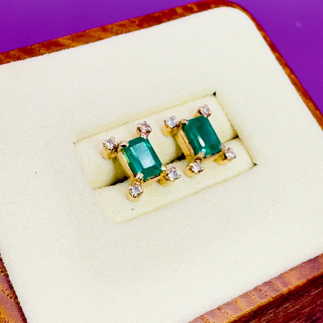 18ct Gold Emerald and Diamond Stud Earrings. The earrings are set with emerald cut emerald approx (0.50ct) with a cluster of 4 (2.5 point) diamonds set to each corner of the stud, totalling (0.10ct). The earrings are 18ct yellow gold and have been fully tested however they are unmarked and date to C.1950's. The earrings are absolutely stunning quality with the beautiful green emerald and the corner diamonds culminating in a stunning unique design. The earrings measures 9mm in length and 8mm in width. The earrings are stud earrings. the total weight is 2.4 grams, The earrings are offered in excellent condition.
