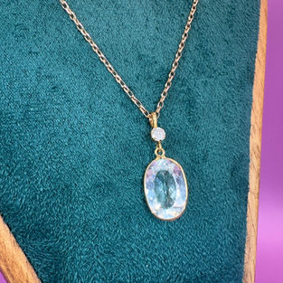 18ct Gold Art Deco Large Oval Cut Aquamarine (7.00ct) & Diamond (0.20ct) Pendant Necklace. The pendant is of beautiful quality, the pendant is unmarked (not uncommon for a period piece) however has been fully tested for 18ct gold . It is set with a beautifully faceted large oval cut aquamarine (7.00ct), set with a round cut diamonds (0.20ct) . The pendant measures 20mm long (inc bale) x 11mm wide. The pendant is presented on a 20'/51cm 9ct gold chain. The pendant necklace weighs 4.5 gram. The pendant necklace is in excellent condition.