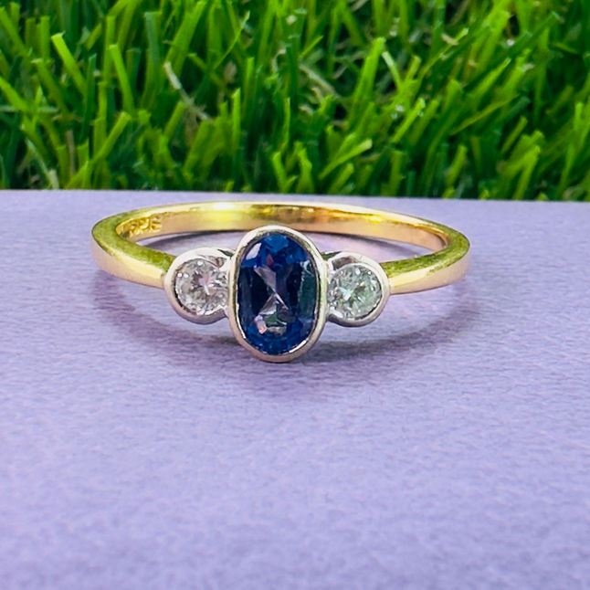 18ct Gold Tanzanite and Diamond three Stone Ring. The ring is set with an oval cut tanzanite approximately (0.50ct),and is flanked by 2 brilliant cut diamonds (8 points) each, totalling (0.16ct), set in a rubbed over 18ct white gold bezel. The ring is fully hallmarked for 18ct gold and marked 0.16 for the diamond weight. The face of the ring measures 2.0cm wide x 0.7cm high and the ring weighs 3.1 grams. The ring is a size Q 1/2 and can be easily resized. The ring is in excellent condition.