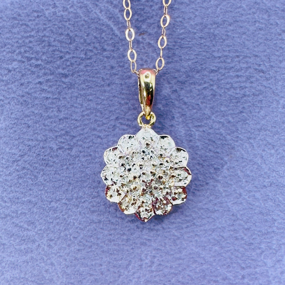 9ct Gold Diamond (0.10ct) Starburst Pendant Necklace. The pendant is stunning quality. The pendant is set with 19 x diamonds, totalling (0.10ct). The pendant is marked for 9ct gold and 0.10 for diamond weight; the chain is also marked for 9ct gold. The pendant is presented on a 9ct gold 16"/40cm chain. The pendant measures 1.8cm long (inc. bale) x 1.1cm wide and weighs 1.9 grams. The item is presented in excellent condition.