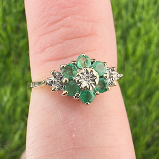 A beautiful vintage 9ct Gold Diamond & Emerald Cluster Ring. The ring is set with a central illusion set diamond (1 point), surrounded by a cluster of 6 x emeralds (5 points) each, totalling (0.30ct). Beyond the emerald cluster on each shoulder of the ring is a cluster of 3 x diamonds, totalling (0.06ct) The face of the ring measures 1.3cm x 0.8cm and the ring weighs 2.1 grams. The ring is a size M. The ring is in excellent condition.