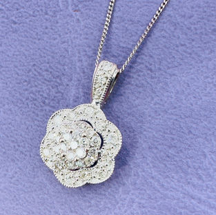 9ct White Gold Diamond (0.40ct) Petal Cluster Pendant Necklace. The pendant is of beautiful quality. It is set with 30 brilliant cut diamond, totalling (0.40ct). The pendant is marked for 9ct gold and DIA 0.40 for the diamond weight. The diamonds are a stunningly clear and white matching the white gold effortlessly . The pendant measures 20mm long (inc bale) x 12mm wide. The pendant is presented on an 9ct white gold 18"/45cm chain. The pendant necklace weighs 2.6 grams. The pendant is in excellent condition.