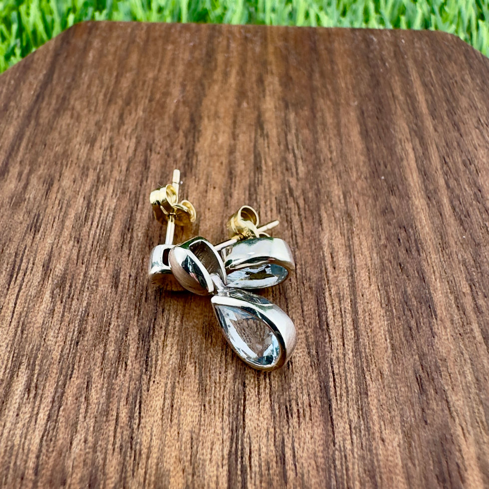 9ct White Gold Pear Cut Aquamarine Drop Stud Earrings. The earrings are set with a pear cut aquamarine (0.75ct) in each stud, the posts of the stud are yellow gold The earrings are marked 9ct gold. The earrings measures 14mm long x 6mm wide. The earrings are stud back designed for pierced ears. the total weight is 2.2 grams, The earrings are offered in excellent condition.
