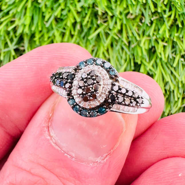 A stunning 9ct White Gold Blue and White Diamond (1.00ct) Cluster Ring. The ring is set with a mixture of baguette cut diamonds and round cut white natural diamonds, intermixed with natural blue diamonds, all totalling (1.00ct). The face of the ring measures 1.1cm x 1.8cm and the ring weighs 2.9 grams. The ring is a size N 1/2. The ring is in excellent condition.
