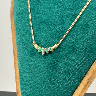 A lovely and super quality vintage9ct Yellow Gold Emerald and Diamond Cluster Pendant Necklace. The pendant is set with 5 marquis cut emeralds, descending in size from the central emerald which is (0.30ct), with 2 emerald next to the central emerald (0.25ct) and the emeralds at each end of the pendant are (0.10ct), totalling (1.00ct). In between each of the emeralds are 2 (1 point) diamonds, totalling (0.08ct). The pendant measures 12mm x 28mm. The pendant is presented on a 16"/40cm 9ct gold chain. The total weight is 4.5 grams and is offered in very good condition.