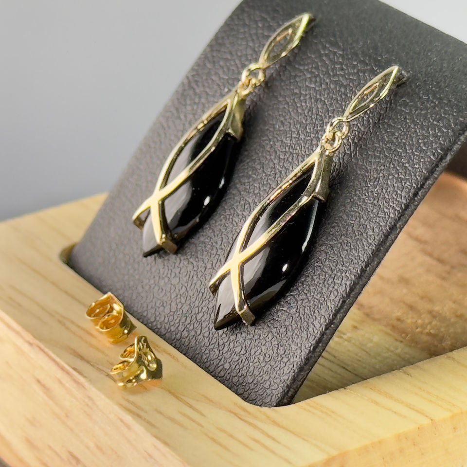 A fine pair of vintage 9ct Gold Pear Cut Black Onxy With Overlapping Gold Stud Earrings. The earrings are of lovely quality set with a pear cut piece of black onyx measuring 1.3cm x 0.8cm (3.00ct). A beautiful pair of vintage pair earrings in excellent condition with the only held in place with overlaying gold. Each measure 26mm x 8mm. Total weight 1.5 grams.