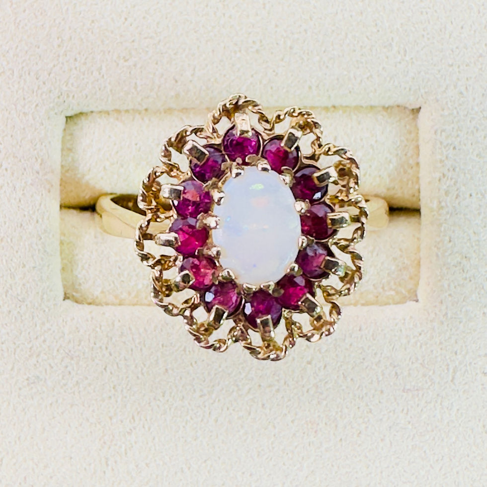 9ct Gold Fiery Opal and Ruby Cluster Ring