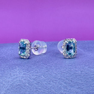 Platinum Emerald Cut Aquamarine and Diamond Cluster Stud Earrings. The earrings are set with a emerald cut aquamarine (0.27ct) surround by a cluster of white diamonds approx (0.08ct) in each stud. The earrings are platinum 900 and are marked to posts of the earrings. The earrings are absolutely stunning quality with the backs of the earrings marked for platinum 900, they are a normal butterfly studs encapsulated in a plastic resin for added security. The earrings measures 8mm in length and 5mm in width. The earrings are stud earrings. the total weight is 1.75 grams, The earrings are offered in excellent condition.